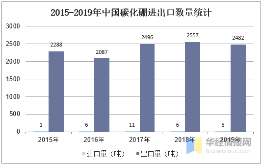 2015-2019年中國碳化硼進(jìn)出口數(shù)量統(tǒng)計(jì)