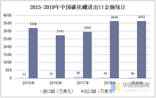 受美國市場(chǎng)萎縮影響甚至略有減少,但隨著國內(nèi)需求的快速增長,出口占比將逐年下降,預(yù)計(jì)未來將延續(xù)這一趨勢(shì)。據(jù)統(tǒng)計(jì),2019年我國碳化硼出口金額為3643萬美元。
